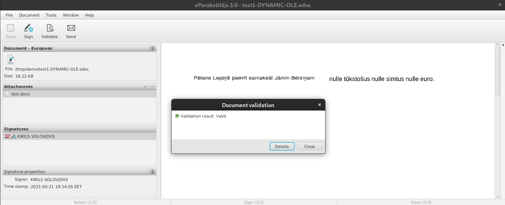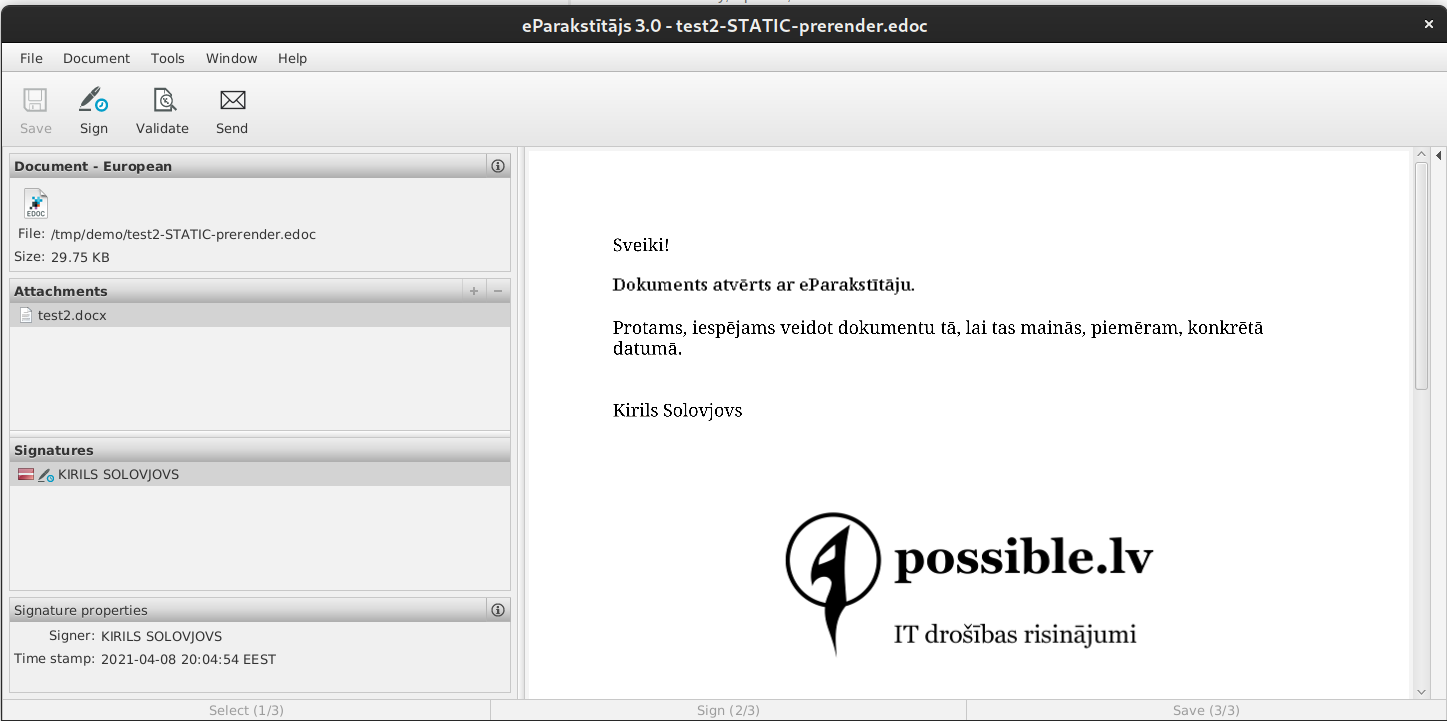 Atverot to pašu dokumentu atkārtoti, tā paraksts joprojām tiek uzskatīts par derīgu, taču redzams, ka apakšējais skaitlis ir cits, turklāt augšējā attēla rindā ir redzama lietotāja ārējā IP adrese.