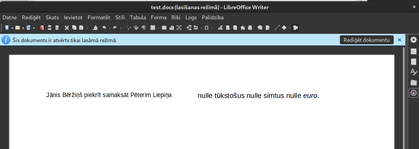 Piemērā redzams, ka dokumenta teksts ir atšķirīgs, atverot parakstīto dokumenta datni eParakstītājs rīka priekšskatījumā un atverot to pašu dokumentu LibreOffice.