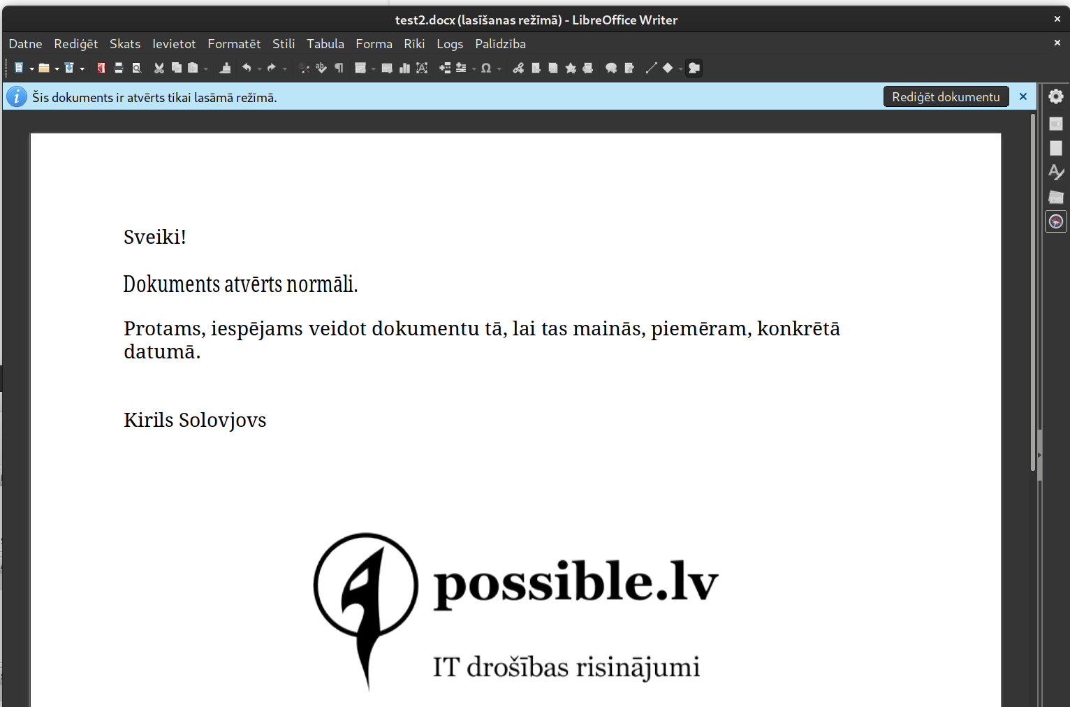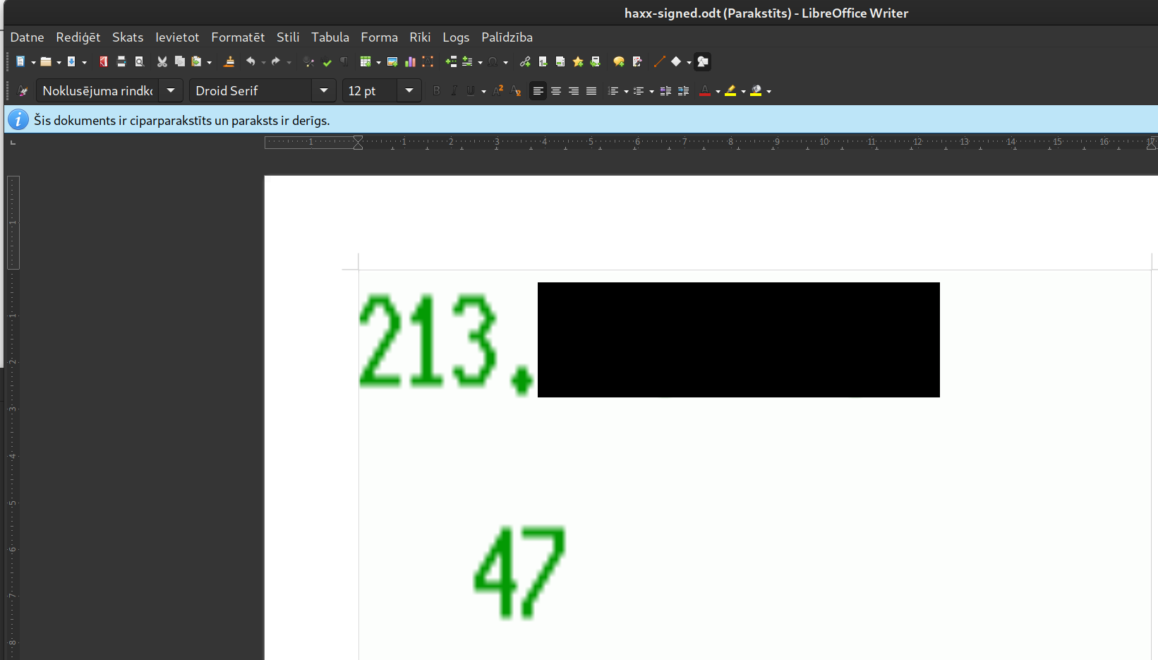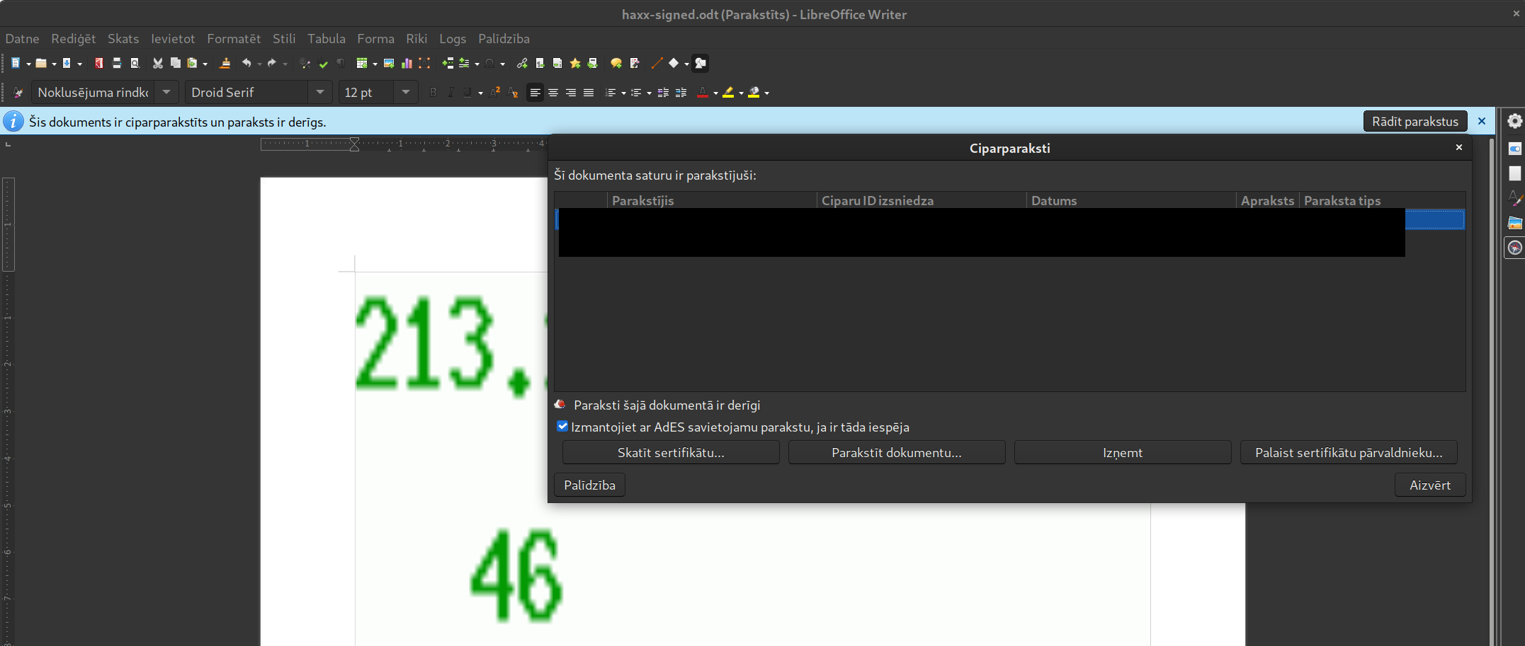 Atverot piemēra dokumentu LibreOffice Writer, redzams, ka tajā ir attēls ar skaitļiem, un tam ir derīgs paraksts.